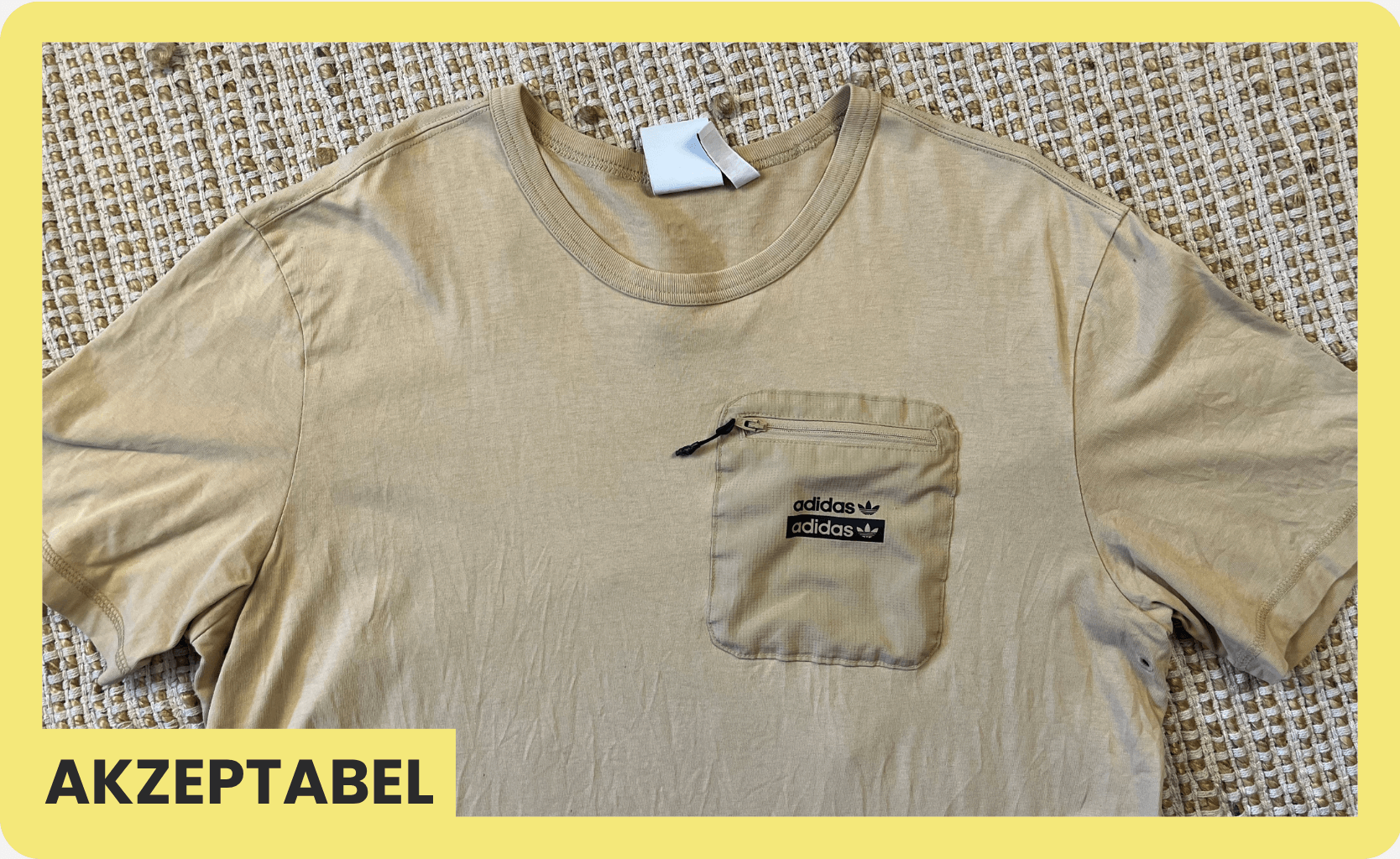 Kategorie Gelb bedeutet, es gibt leichte Mängel, die durch den Gebrauch des Kleidungsstück zu rechtfertigen sind. Dennoch muss der Zustand im wahrsten Sinne tragbar sein. In diesem Fall kannst du davon ausgehen, dass der Verkaufspreis etwas geringer ausfallen wird, als bei makelloser Second Hand Ware, aber sie ist verkaufbar.