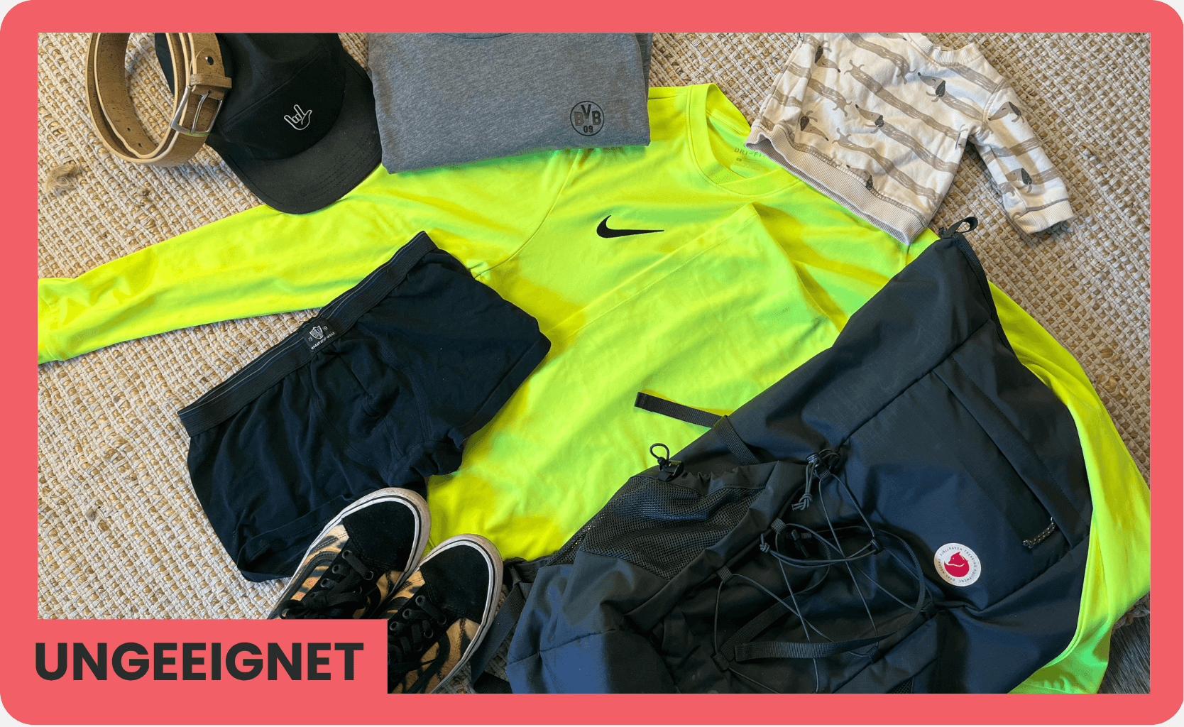 Sportbekleidung/Trikots (oftmals Nylon/Polyester), Jogginghosen, Schuhe in jeglicher Form, Accessoires, Unterwäsche, Lifestyleartikel von Sportvereinen (Bsp. Fußball), Kleidung in Kindergrößen, Taschen/Rucksäcke