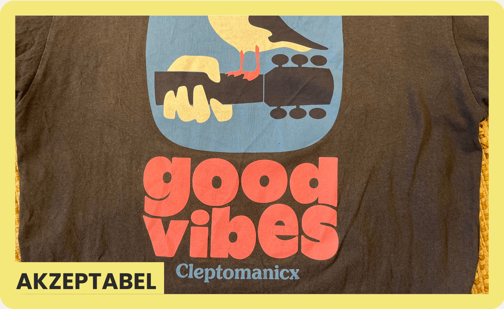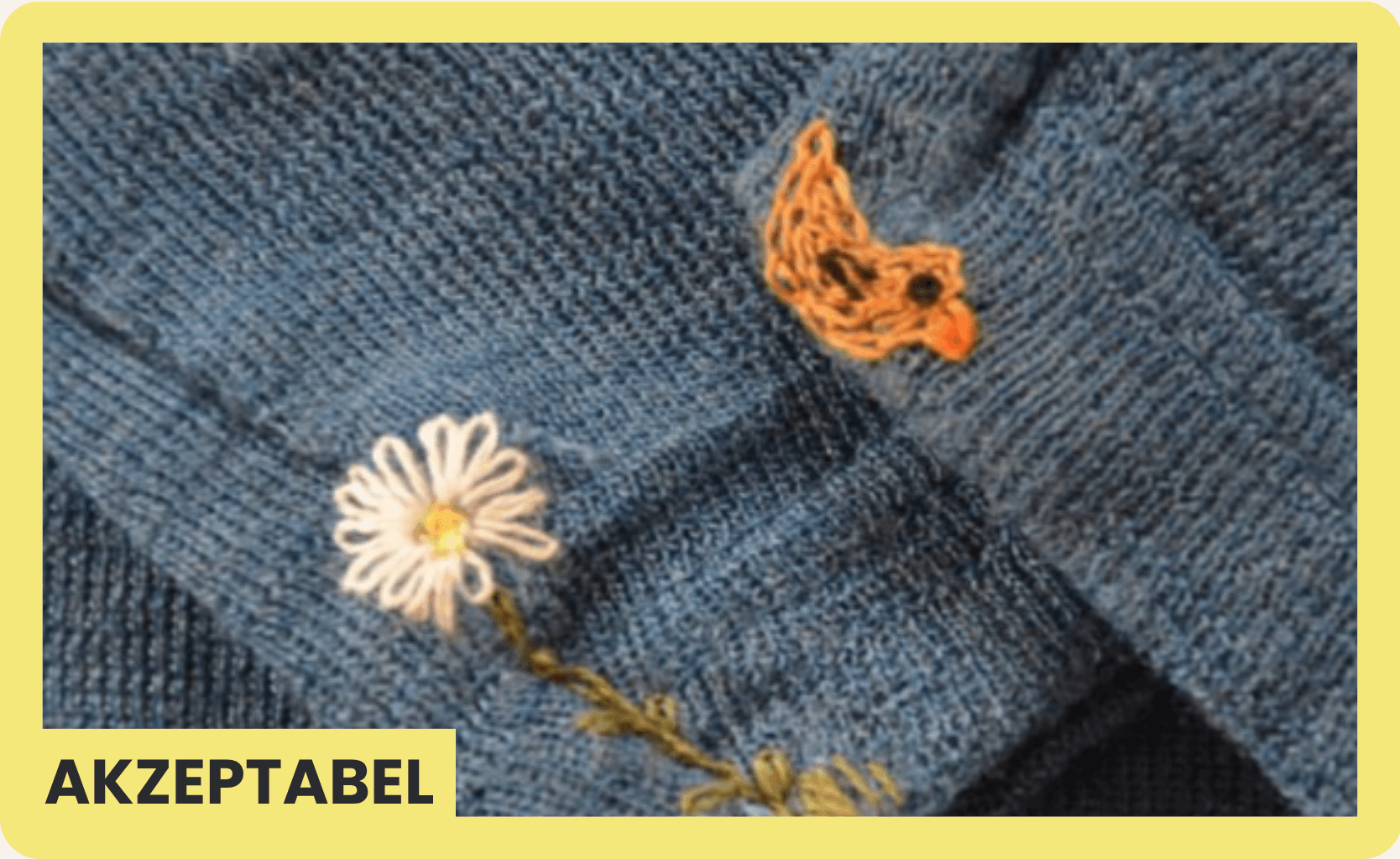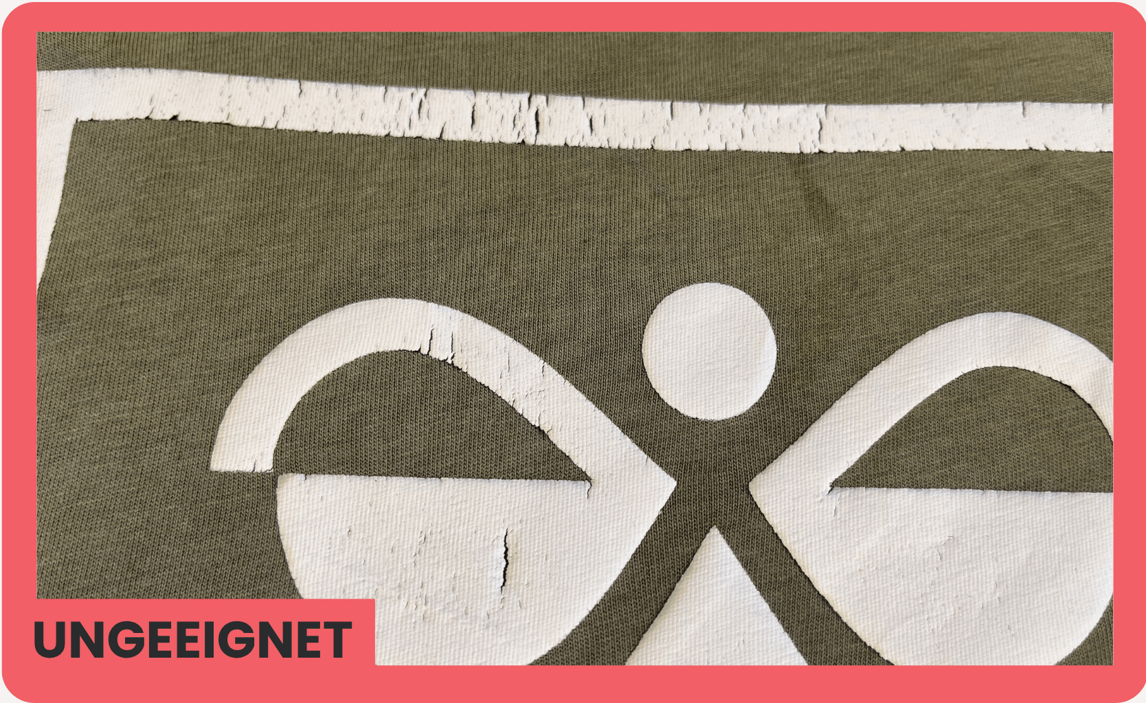 Der Print ist rissig, abgeblättert oder sehr stark ausgebleicht. Lose Fäden oder Beschädigungen bei gestickten Details.