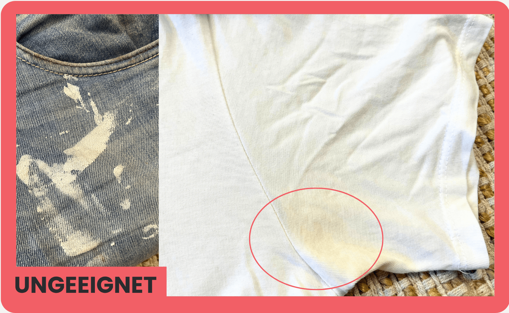 Deutliche Verfärbungen insbesondere am Kragen und unter den Armen (Bsp. T-Shirts) oder bleibende, nicht auswaschbare Verschmutzungen.