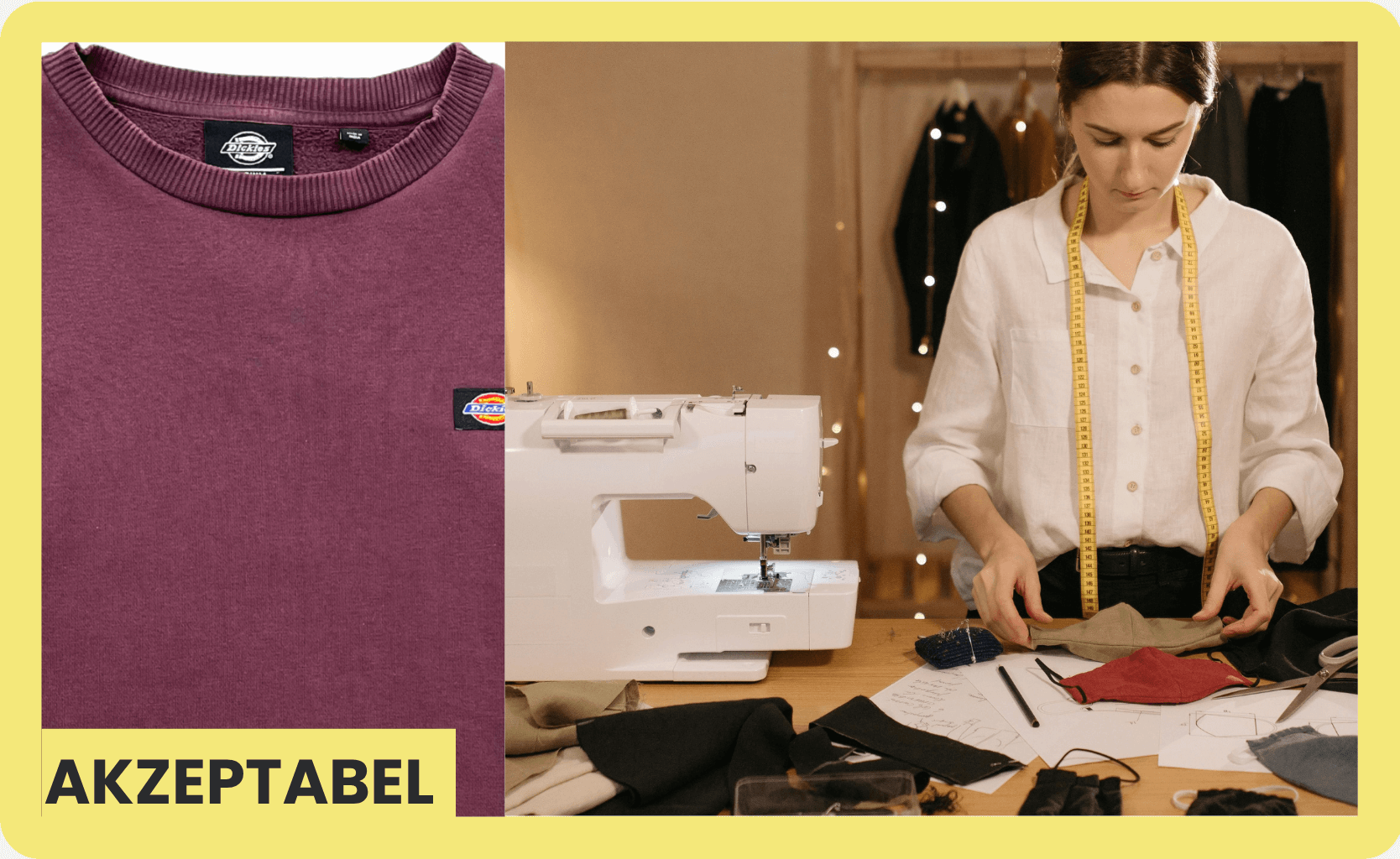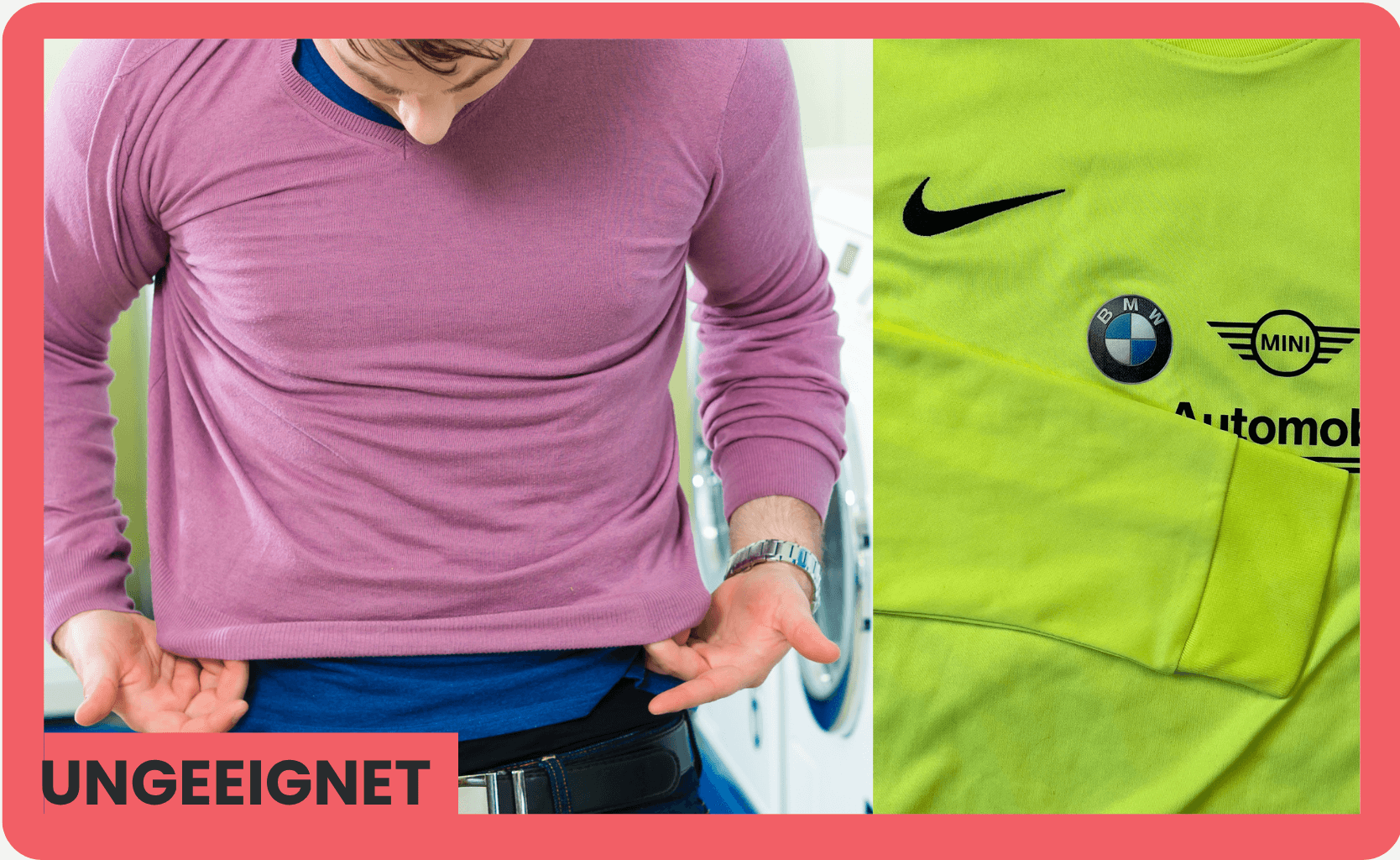 eingelaufene Kleidungsstücke, stark ausgeleierte Säume, Personalisierungen, Firmen-Sponsoring, jegliche Art von Verformung, die die Passform negativ beeinflussen inkl. Ausbeulungen