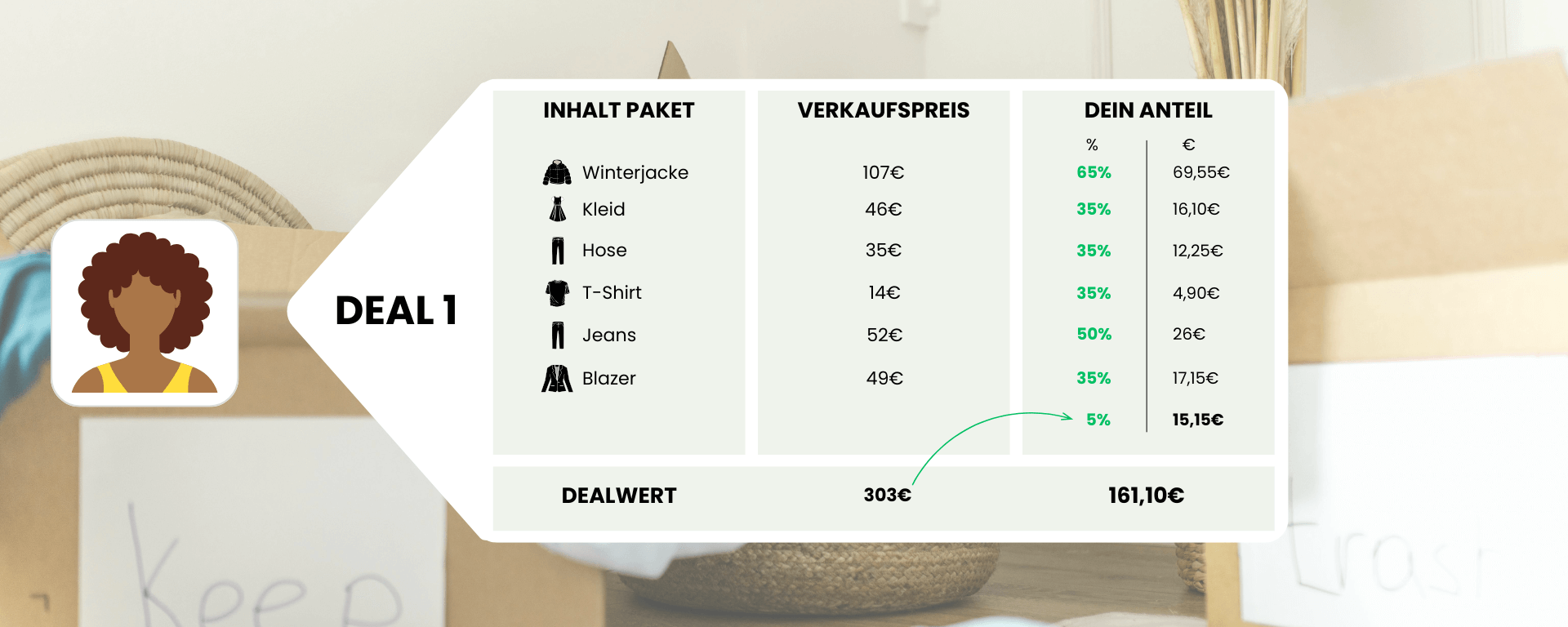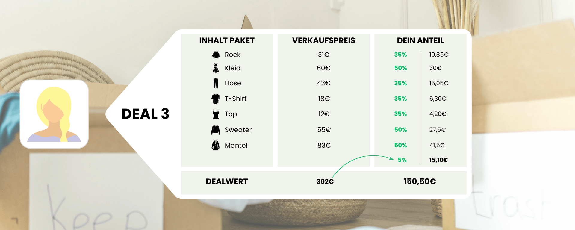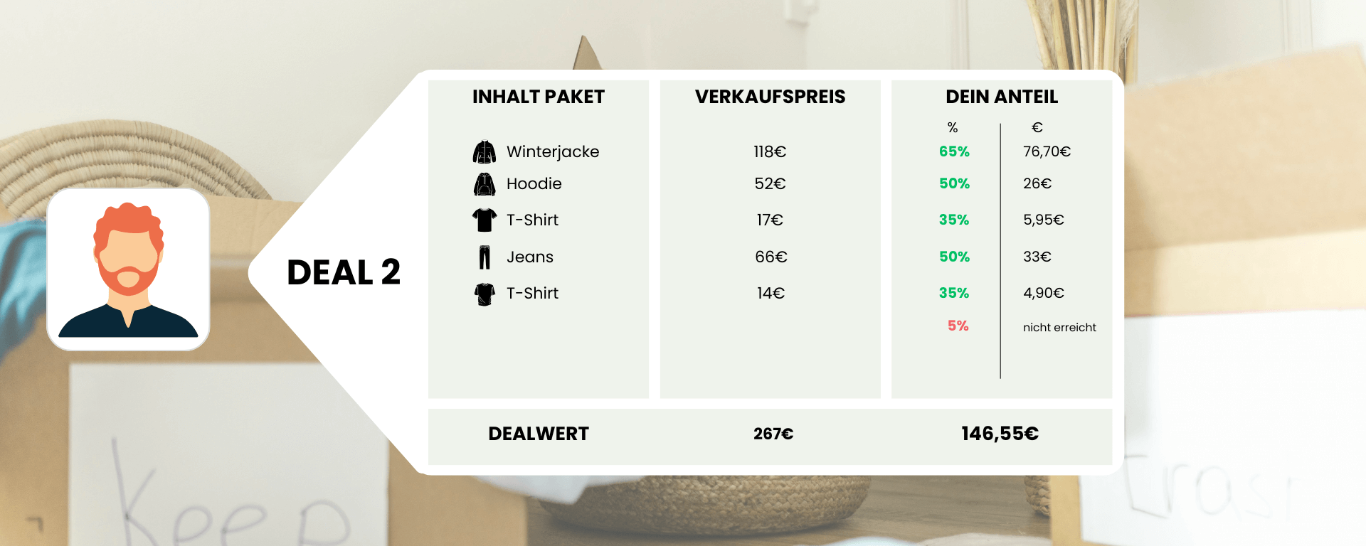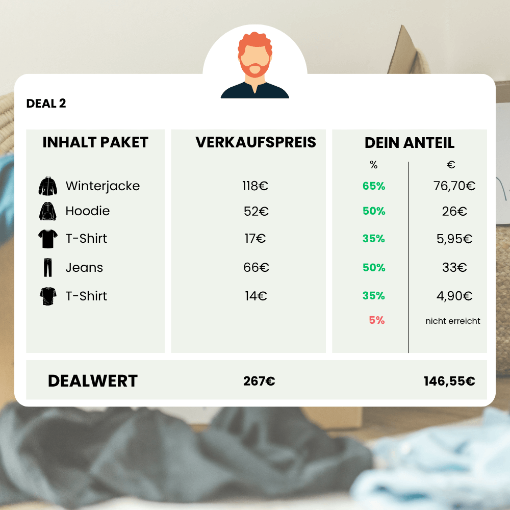 In Stufe 2 schauen wir uns dein gesamtes Deal-Paket nach erfolgtem Verkauf an. Wenn wir mit deinem Deal-Paket in Summe mehr als 300,00€ erzielen konnten, erhältst du noch einmal 5% Bonus auf die Summe der erzielten Verkaufspreise!